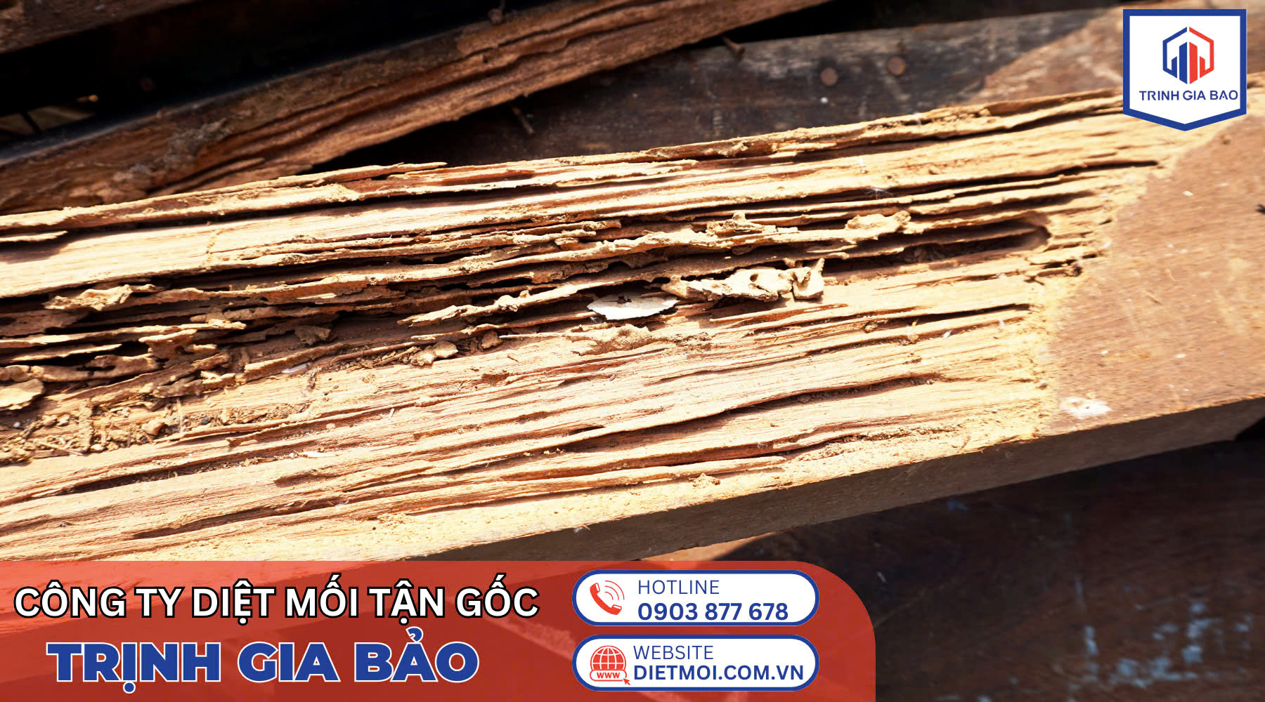 - Gỗ bị ăn mòn và có dấu vết của phân mối.